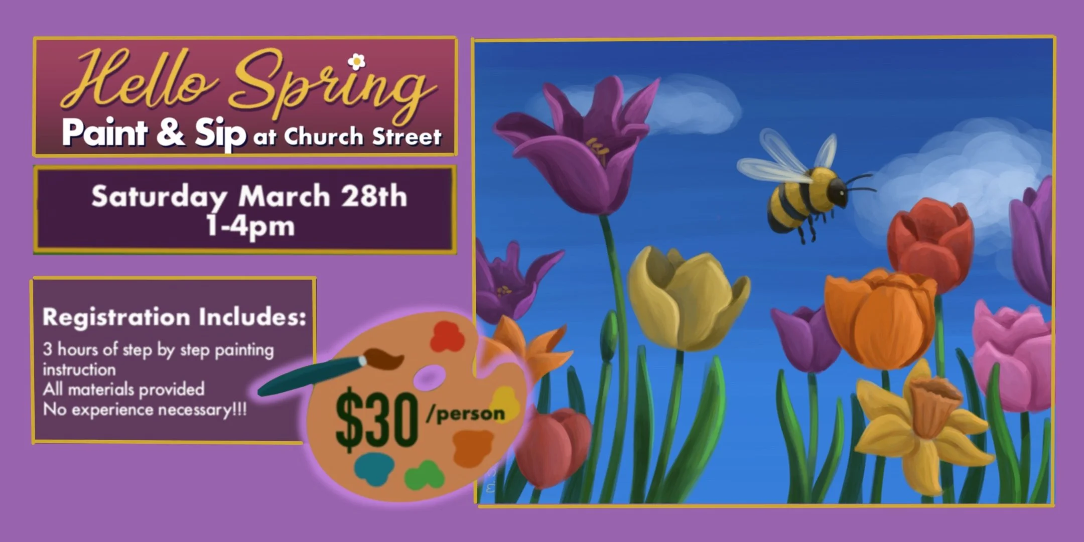 Spring is finally here! The weather is getting warmer and the flowers are starting to bud. Come celebrate the start of the season by painting some brightly colored flowers with a buzzy bumblebee at our "Hello Spring" paint and sip class. Grab some brushes and let your creativity flow with a night of painting, delicious beers, and good vibes.