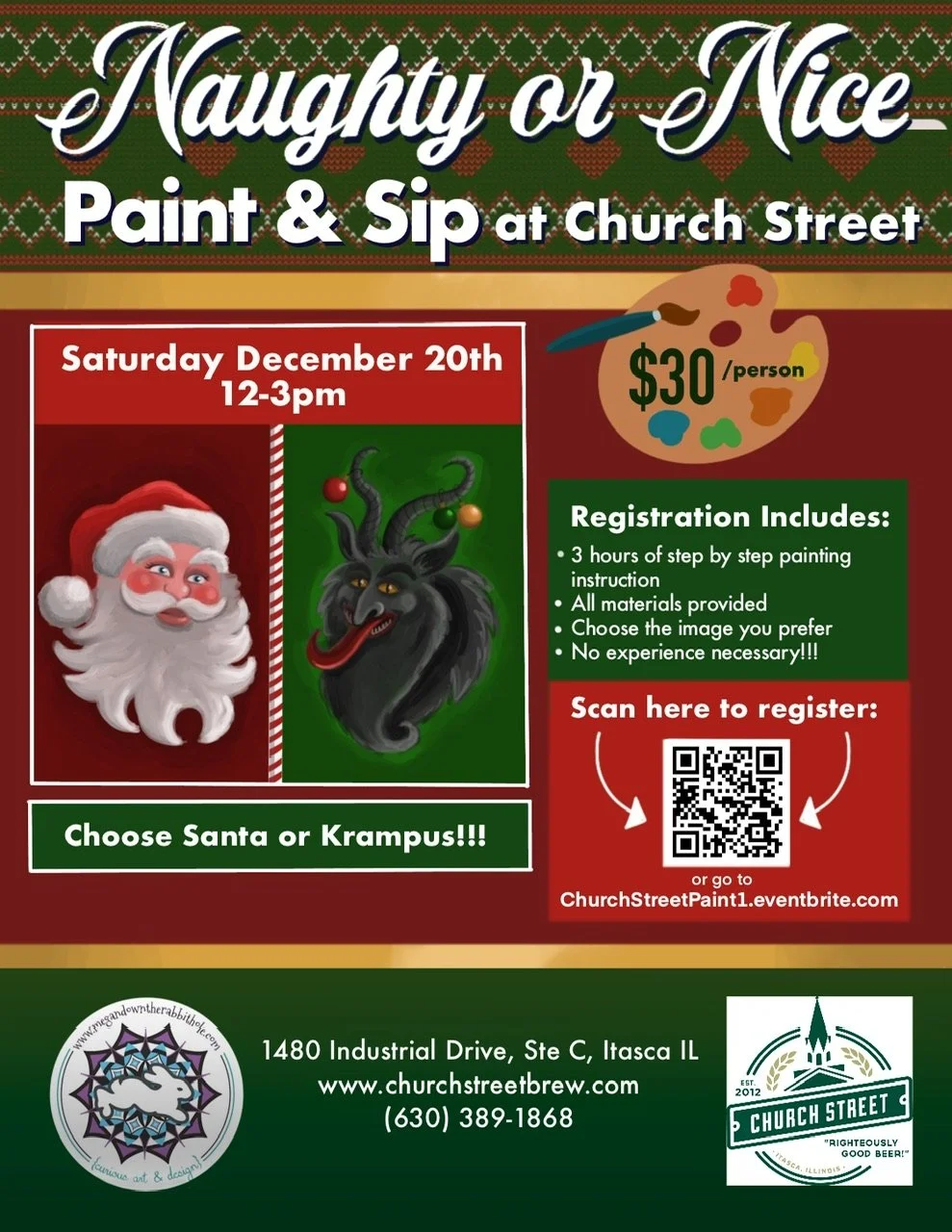 The holidays are right around the corner! Join us at Church Street Brewing for a lively and fun "Naughty or Nice" paint and sip event! Grab some brushes and let your creativity flow with a night of painting, delicious beers, and good vibes. Whether you've been naughty or nice this year, we have an image for you! Choose from either Santa or Krampus - if you're feeling ambitious you could even put both on your canvas.