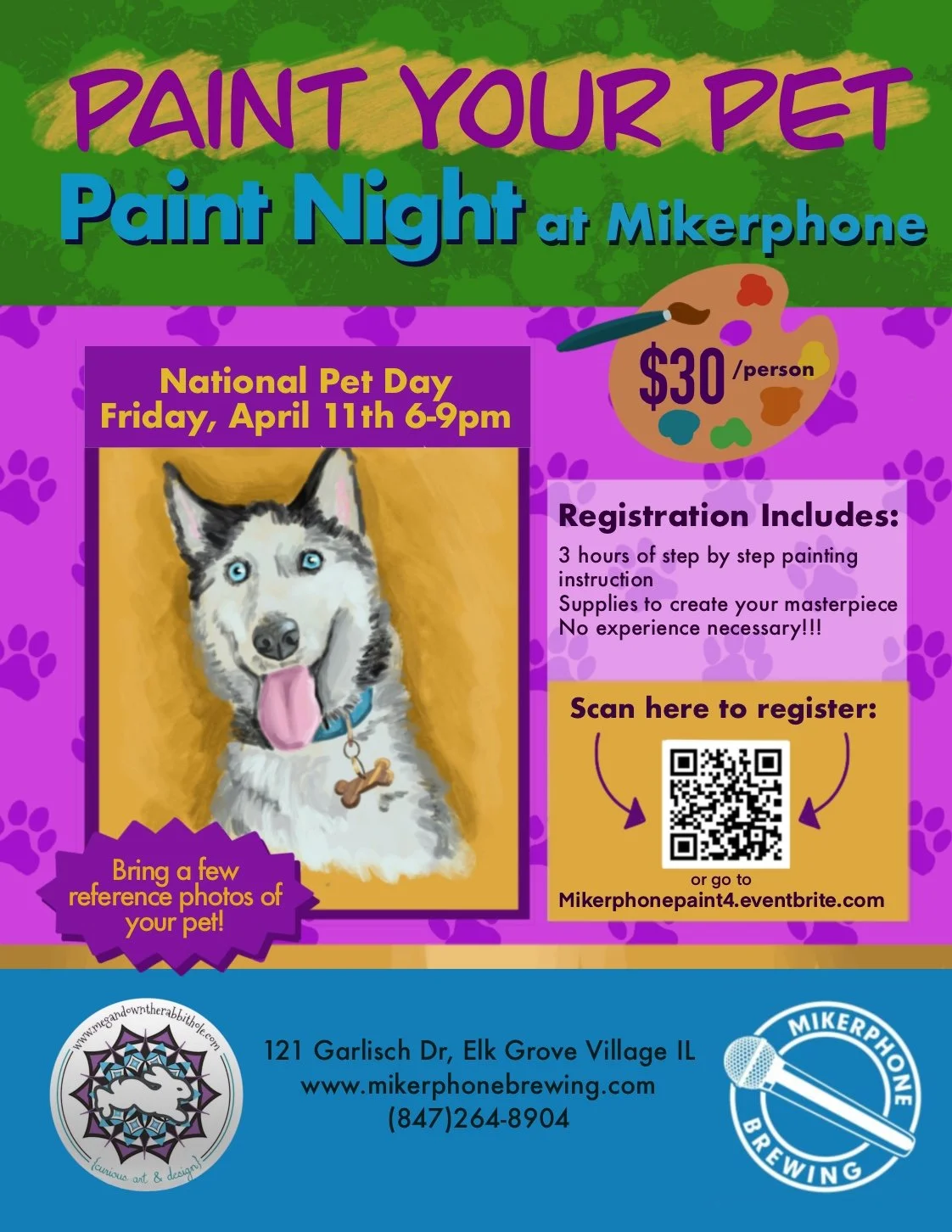 Join us to celebrate National Pet Day at Mikerphone Brewing for a lively and fun "paint your pet" paint and sip event! Grab some brushes and let your creativity flow with a night of painting, delicious beers, and good vibes. Bring a few reference photos of your pet and we'll guide you through the process. No experience necessary, just bring your artistic spirit! Whether you're a seasoned painter or just starting out, this event is perfect for anyone looking to unwind and unleash their inner artist. Your instructor Megan Hlavach Stodola will guide you through the process of composing your drawing, mixing colors, various brush techniques, and help with any individual instruction you may need to complete your painting. Don't miss out on this opportunity to create a masterpiece in a relaxed and social atmosphere. See you there!